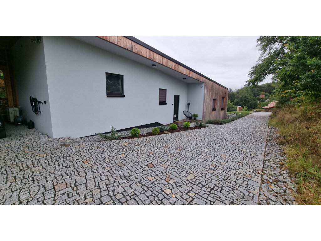 Tradiční žulová dlažba se štípaným povrchem pro maximální odolnost a protiskluznost. Díky pokládce do štěrkového lože zajišťuje vynikající drenážní schopnosti a přirozený odvod dešťové vody. Ideální volba pro příjezdové cesty, chodníky nebo terasy, kde vyžadujete materiál, který přežije generace bez ztráty kvality.